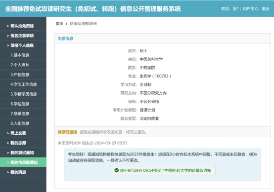 2024年9月,赵京获得了全国优秀应届本科毕业生免试攻读硕士学位研究生推免资格,推免至中国药科大学攻读硕士研究生。