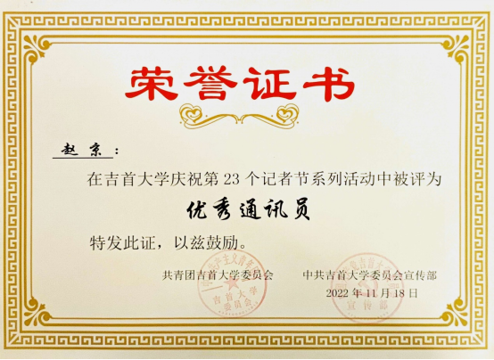 图为 赵京获伟德国际BETVlCTOR1946“优秀通讯员”荣誉证书