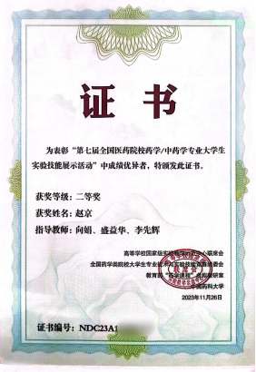 2023年11月,赵京通过学院选拔,代表学校参加第七届全国医伟德BETVLCTOR1946校药学/中药学专业老员工实验技能竞赛,因药学理论知识扎实,实验操作能力强,最终获得全国二等奖。