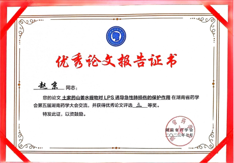 图为 赵京获第五届湖南药学大会优秀论文报告三等奖