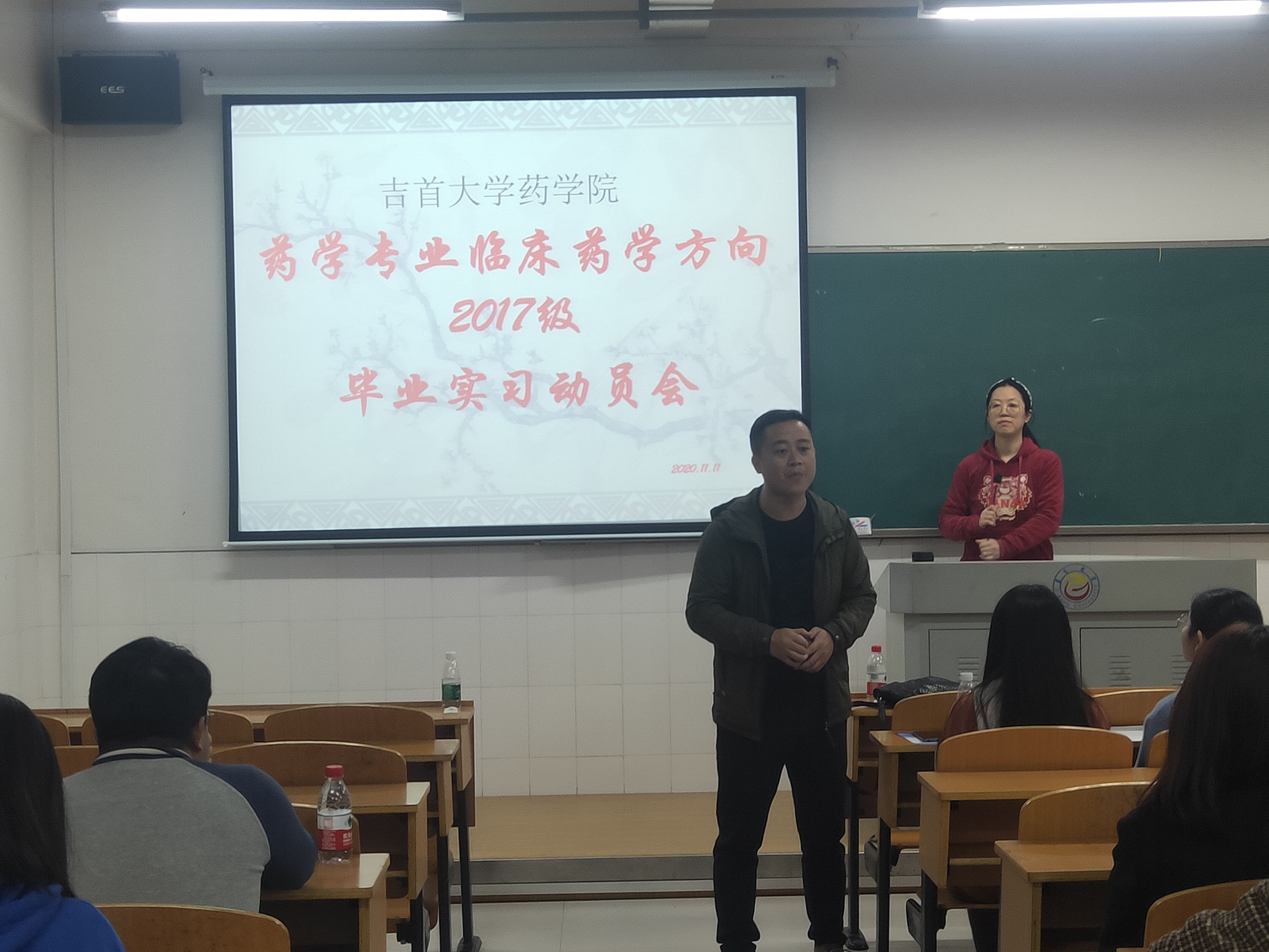 本网讯(通讯员 孙宇兴、章扬)11月11日20:30,公司在2402教室开展2017级药学专业临床药学方向毕业实习动员会,动员会由盛益华老师主讲,彭俊老师主持。