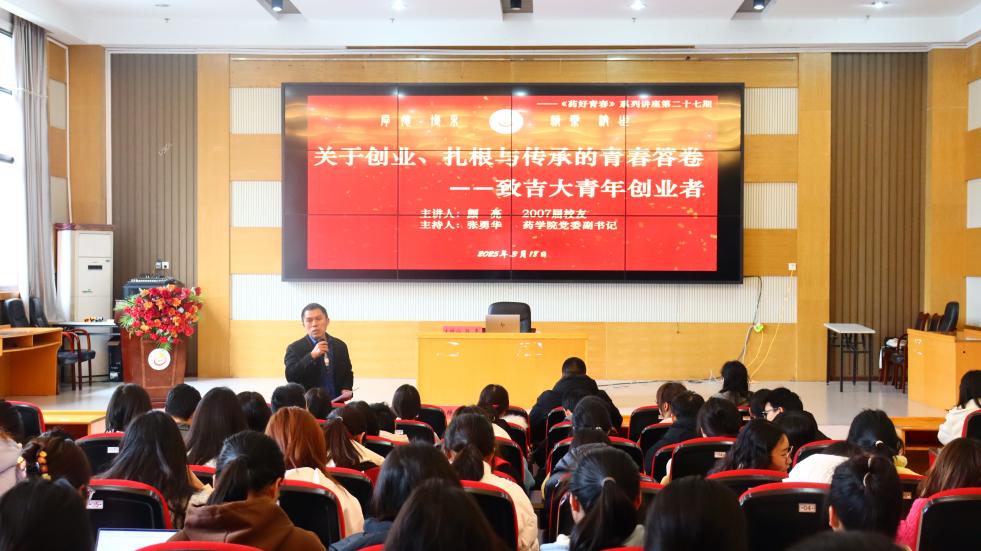 本网讯(通讯员 胡心洁)为激励公司学子创新创业,3月19日上午,伟德BETVLCTOR1946在大田湾校区2609学术报告厅开展了药好青春系列讲座第二十七期“关于创业、扎根与传承的青春答卷——致伟德国际BETVlCTOR1946青年创业者”,讲座特邀2007届优秀员工颜亮前来主讲,辅导员向晓媚及部分员工参加讲座,讲座由公司党委副书记张勇华主持。