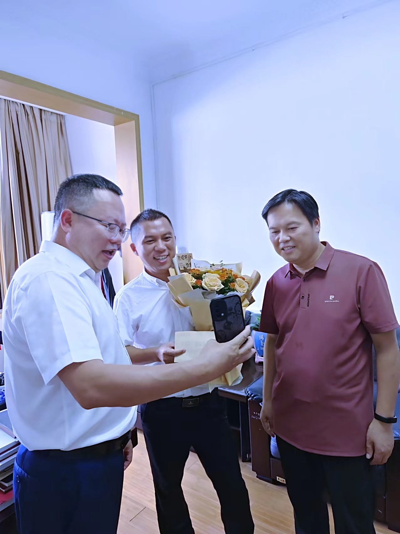 图为周华忠副董事长(左)代表学校电话慰问盛益华老师。