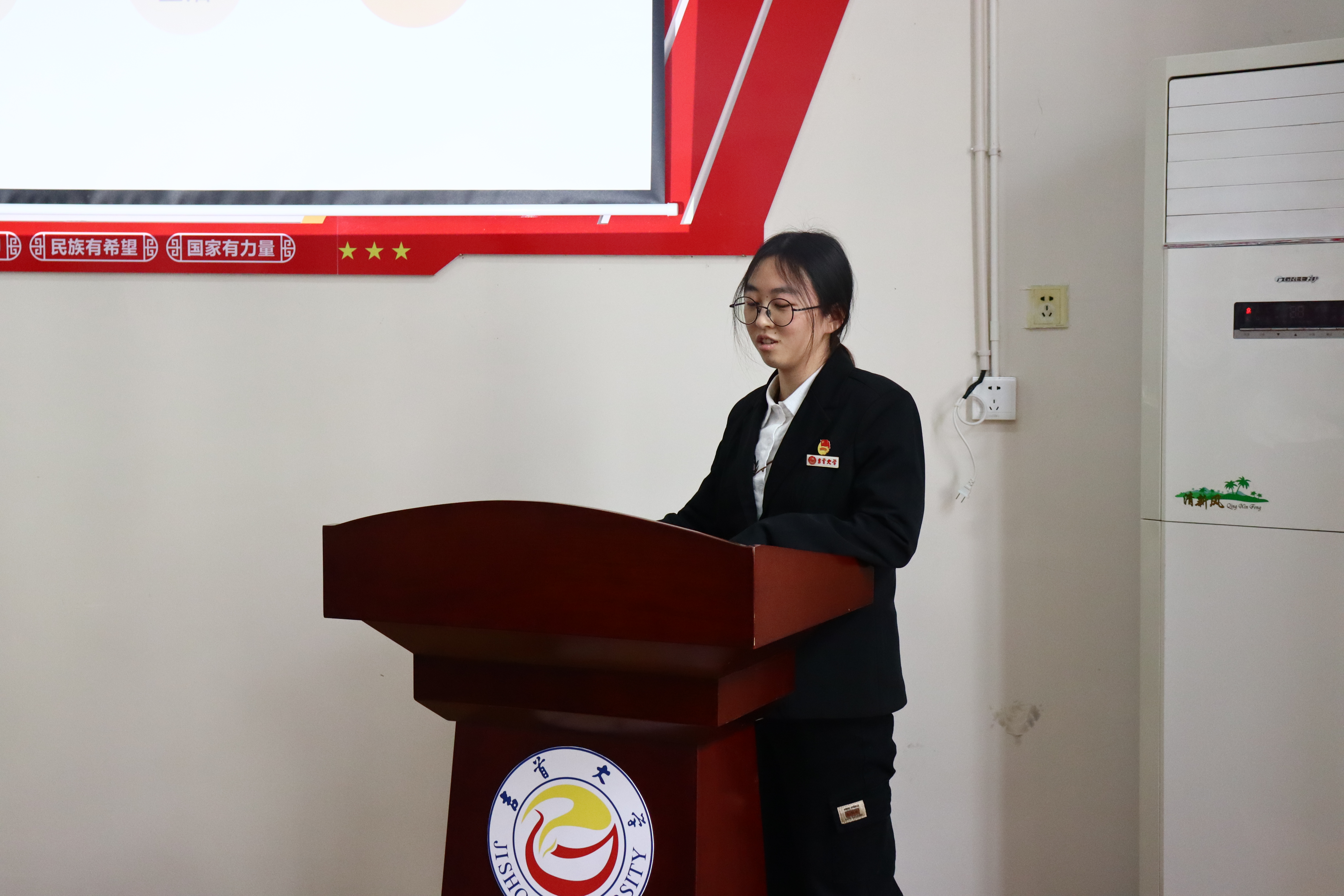 在大会上,各组人员的代表人在台上用精炼的语言以及所相关的视频分别从研究意义、研究背景、研发过程、研发思路等方面将自己的作品展现给在场师生。