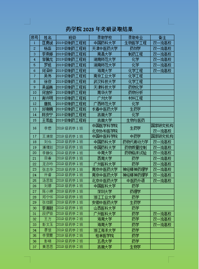 据统计分析,2023届毕业生163人,报名参加考研员工60余人,参加复试43人。全年级录取共计37人,占全院总人数的22.7%。此届毕业生考研情况有几个亮点,一是考研质量持续向好,录入国家研究机构及双一流高校的员工19人占比51.4%,其中包括中国医学科学院北京协和医学院、中国中医科学院、中国药科大学等医药类顶级单位;二是专升本员工班级(学院首届)考取研究生7人,占比17.5%。2023届员工在延续2022届高质量考研的基础上,考研数量增长近5个百分点。