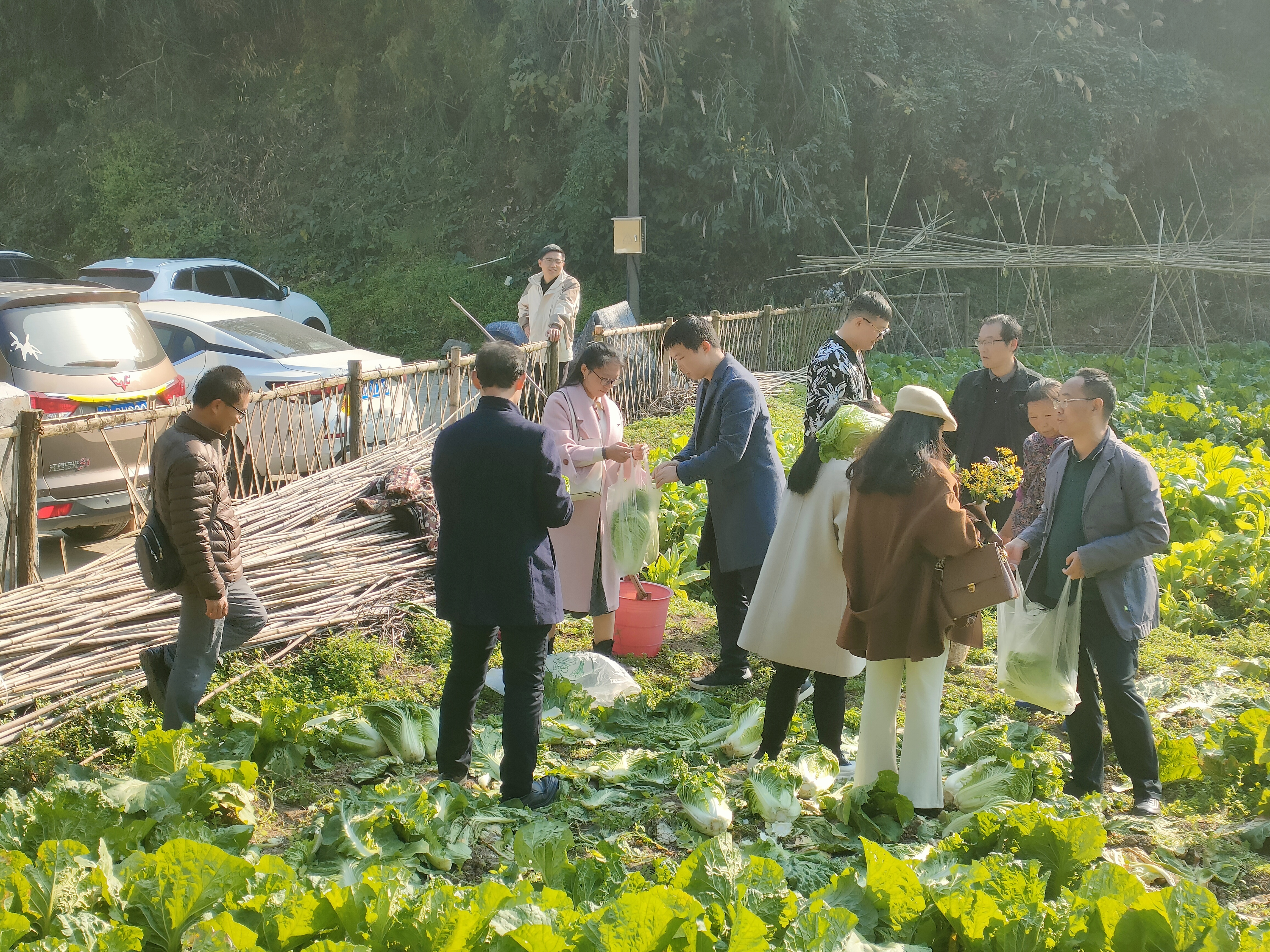 图为 教工党员在菜地买菜,为村民做点小实事。