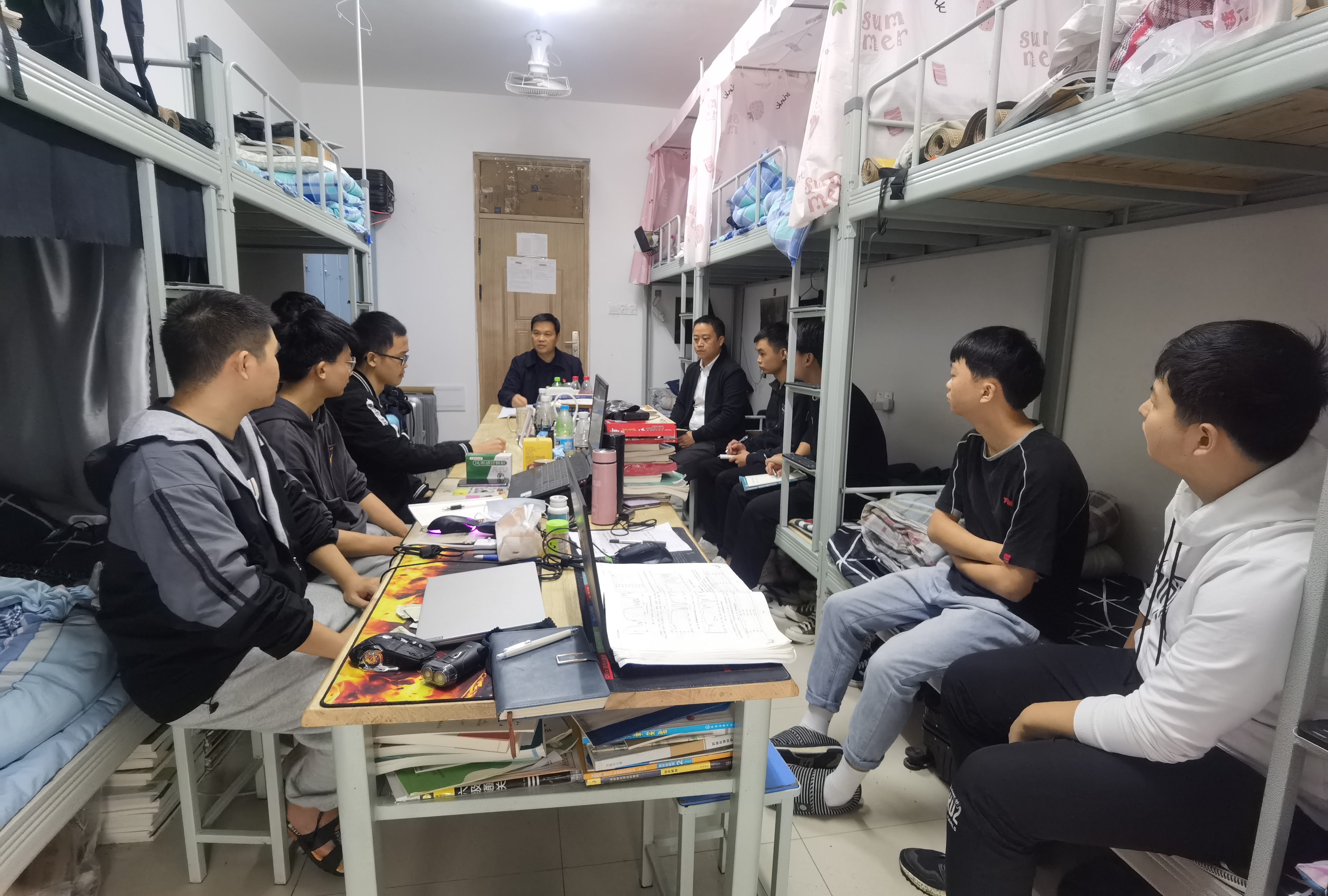 本网讯:(通讯员 张忠怀)10月26日上午,为推进党史学习教育工作,贯彻落实《公司党史学习“六百工程”实施计划》,积极开展“百位教师深入百间宿舍”活动,公司党委副书记王江生深入员工宿舍,与对接宿舍2#116寝室2019级制药班的八位同学围绕如何将宿舍建为“文明整洁、学风优良、和谐互助、安全有序”的阵地进行了座谈交流和指导。