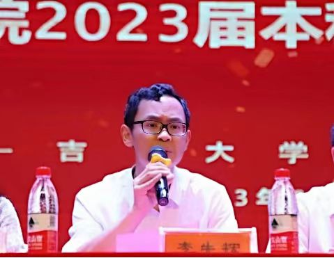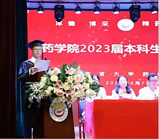 毕业生代表苏马正睿发言,他向学校和学院的老师、同学致以诚挚的感谢。并表示将铭记“以人名校,以人报国”的校训,践行“厚德、博采、精药、济世”的院训,励志做一名有理想、敢担当、能吃苦、肯奋斗的新时代好青年,为祖国医药卫生事业的发展而奋斗,为中华民族伟大复兴贡献出自己的一份力量。