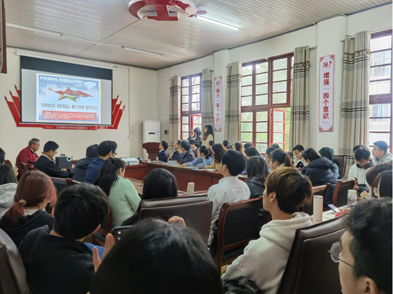 会议之初,石维海老师从领会学习党史的重要意义、具体要求、学习重点以及学习方法四个方面,阐述党中央在“两个百年”历史交汇点上,发动全党开展党史学习教育的重要决策。随后,从“立党三问主,辉煌一百年”“立党三问根,百年造辉煌”“立党三问计,伟业永辉煌”三个层面,通过一个个历史故事和反思,深度讲解中国共产党百年以来带领中华民族从新民主主义社会走向中国特色社会主义的光辉历程。同时,运用一系列的统计数据,印证了中国共产党百年来在制度的革新、科学技术的进步、经济水平的发展以及国际地位的提升等方面,逐步引领着中华民族迈向繁荣昌盛的事实。最后,石维海老师结合党的发展蓝图,勉励现场师生党员增强“四个意识”、坚定“四个自信”、做到“两个维护”,锤炼铁一般的信仰、信念、纪律和担当,汇聚“七种能力”,施展“八项本领”,凝聚全党力量,向下一个百年目标迈进。讲座期间,为了使现场党员同志深刻体会共产党人的初心和使命,石维海老师深情演唱为纪念和歌颂英雄谱写的经典红色歌曲《为了谁》,现场掌声四起。