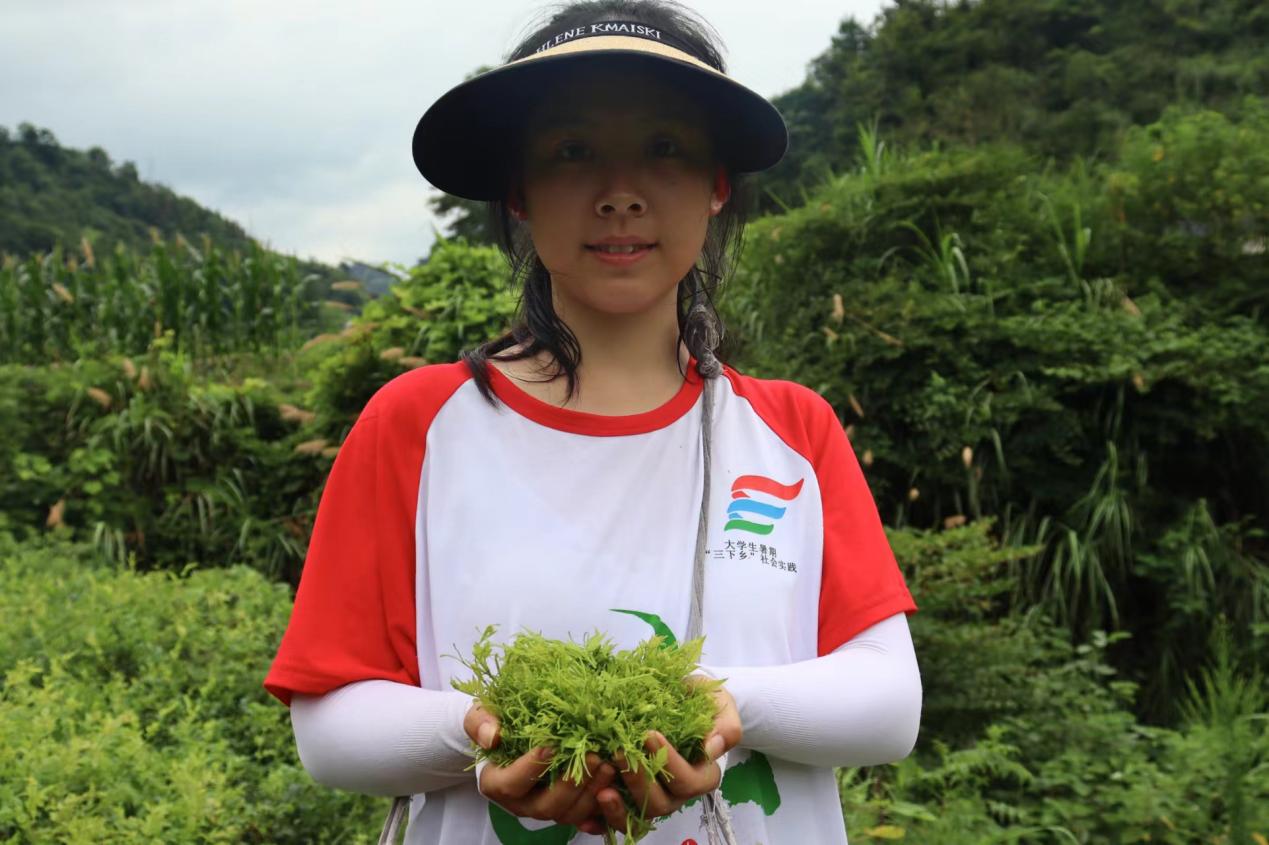 背上背篓,化身茶农,调研队队员跟随伟德国际BETVlCTOR1946永顺莓茶种质资源创新研究基地负责人向阿姨进入茶田。在向阿姨的详细讲解下,队员们学习了采茶的技巧以及相关的注意事项。随后调研队队员按照“一芽一叶”的原则,两人一组分别从茶田两端开始采茶。经过三个多小时的劳作,队员们完成了两块茶田的采摘,共采到5斤莓茶鲜茶叶。烈日格外刺眼,茶田里蚊虫飞舞,衣服早已被汗水浸湿,但是队员们依然兴致勃勃,干劲十足。