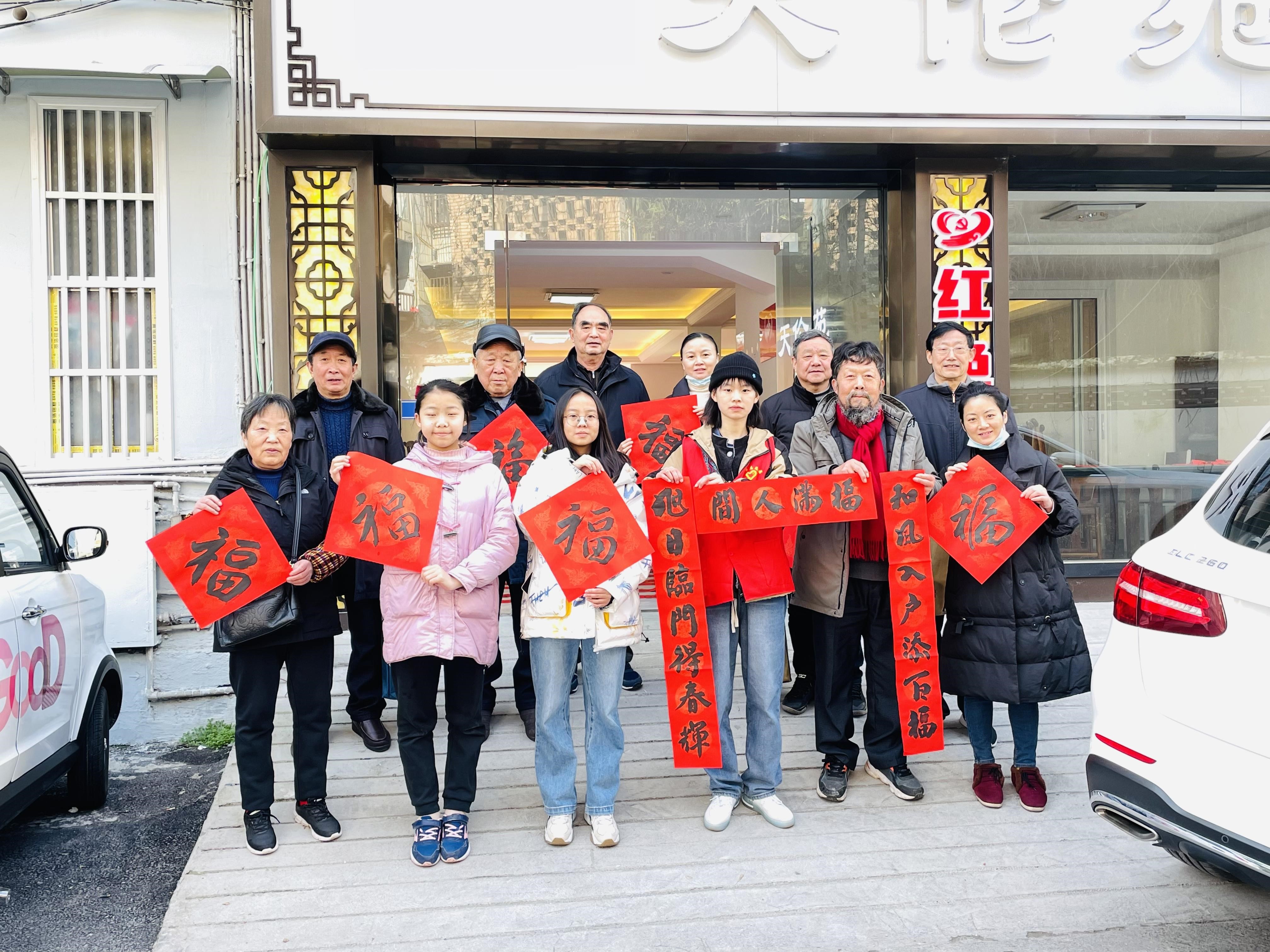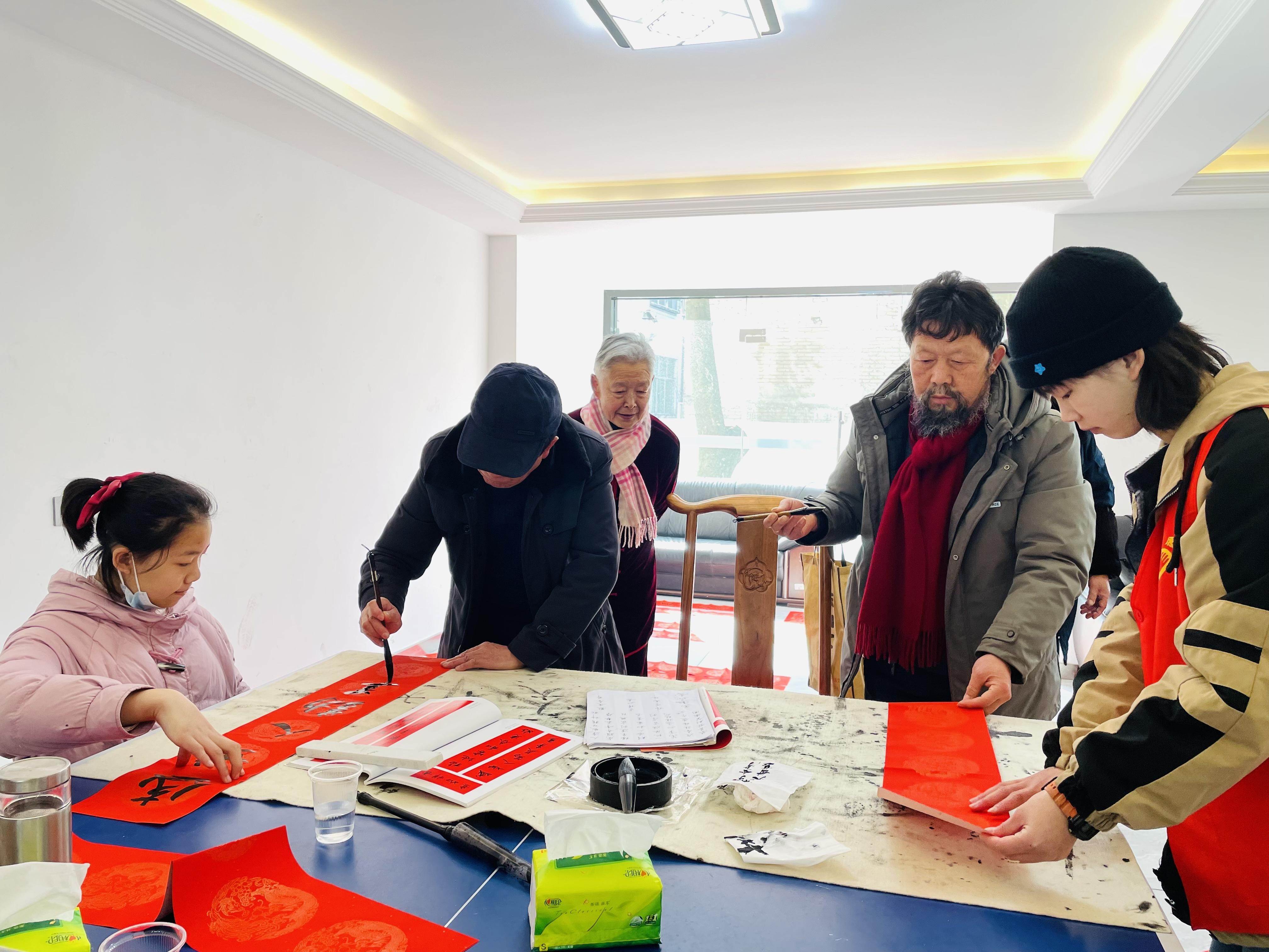第二天早上,给由爷爷奶奶在官坡社区组成的书法队当了小助手,为增添年味,走进社区,每年他们都要写对联送给百姓。我帮他们倒茶、晒对联之类,主要是给一位刘爷爷整理对联,保证对联舒畅稳定,刘爷爷的毛笔字大气但每一笔都有讲究,每一笔划都恰到好处,到位,观赏者都是享受的“‘福’字的‘一’和‘口’要小,下面的‘田’右边部分要向左靠,左部分向‘示’旁靠,这个‘长’的上部分是三短横,看着才美观“,”‘安’字其实很难写,上面的宝盖一定要窄,头上一点与女连在一起,把上面托起来,‘女’看似简单,想要写好,右边必须靠近左边,留很窄的空隙”。仅早上几个小时就学到了很多毛笔字的诀窍,都是爷爷奶奶几十年来写出来的经验以及他们学到的东西,我很荣幸能够碰到他们,感谢他们的分享,受益终生,也更进一步体会到中国汉字的魅力,增强了对毛笔字的兴趣,光一个“福”字刘爷爷就写出来七八种字体,他们说有百来种写法,我更深刻地体会到中华文化的博大精深。