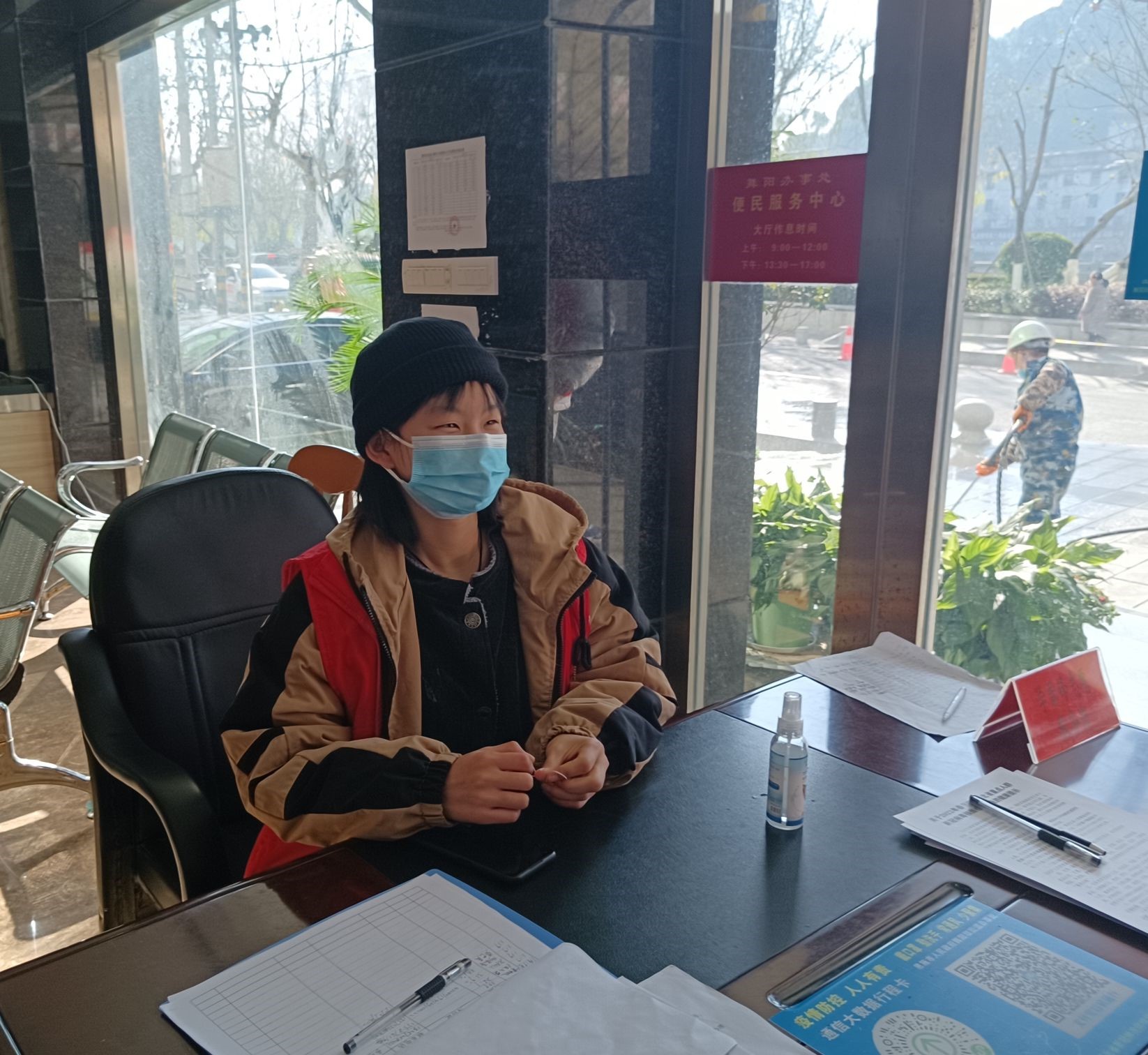第三四五天与工作人员也慢慢熟悉起来,早上到岗位的时候会和上班的哥哥姐姐、叔叔阿姨互相问好,他们的微笑让我一大早就保持好心情,困意自然是抛到脑后,充满激情和动力。他们都会戴好口罩,自觉扫行程码,积极配合工作。就算有急事搞忘记了,他们也会玩笑一句“哟哟哟,不好意思,忘记戴口罩了,没配合好你们的工作”说完也会马上戴上口罩。在这里感受到很多温暖,很快乐。19号遇到一个腿脚不利索,记忆也不太好的老奶奶办工资年审,工作人员说需要去银行修改密码,大概是感到过程繁琐,有点害怕,整个人也紧张得腿抖,我们这边的志愿者看出了奶奶的无助,马上过去搀扶着,打车带领她办完了所有流程。分别时老奶奶的笑容让我们感到幸福值得,系列事情真真切切让我觉得社会是一个温暖的大家庭,人与人之间的信任和帮助让我感动,满满正能量让我更热爱生活,更热衷社会服务,热衷参加志愿者活动。何阿姨每天都会问候我们冷不冷,累不累,帮我们开火炉,嘱咐我们戴好口罩,到点喊我们去吃饭,中午还邀请我们去她办公室休息。结束的时候,“崽崽娃儿,下班了哈”,一个叔叔路过的时候微笑着对我说,开心的执勤工作便结束了。
